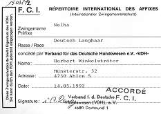 ![]() | ![]() Antwort: Wir wohnen in Ahlen, dreht man das Wort um, heißt es NELHA, so einfach ist die Erklärung (natürlich ist das aus einer "Bierlaune" heraus entstanden!). | ![]() Der internationale Zwinger- schutz erfolgte 1992 |